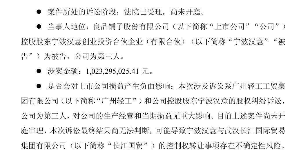 然而,宁波汉意及其一致行动人在2025年5月28日没有与广州轻工签署相关股权交易协议,为此,广州轻工向宁波汉意发出《关于督促签署交易协议的函》。截至目前,宁波汉意及其一致行动人仍未与广州轻工正式签署有关良品铺子股份的交易协议。因此,广州轻工提起诉讼,涉案金额约10.23亿元。