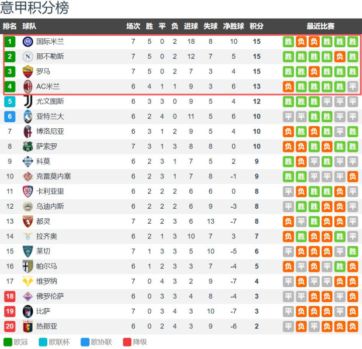 那不勒斯和罗马输球,国际米兰赢球,三队都是5胜2负积15分,国际米兰净胜球10个,高于那不勒斯的5个和罗马的4个,意甲榜首易主,国际米兰以净胜球的优势登顶。但排名第四、积13分的AC米兰若本轮意甲赢球,即可再一次让意甲榜首易主。
